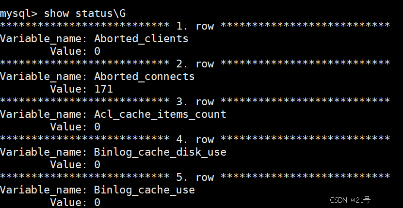 • 查看服务器在运⾏时的⼀些统计和状态指⽰器,连接到MySQL并执⾏以下语句: