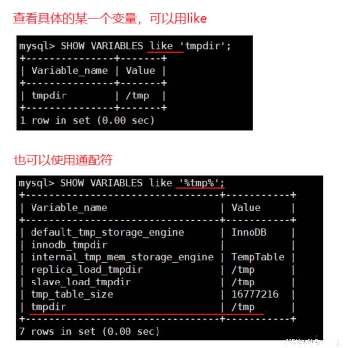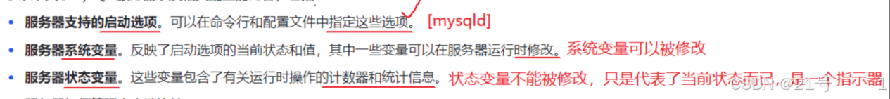 服务器启动时设置的系统变量,系统变量可以在连接MySQL后使⽤ SHOW VARIABLES 语句查