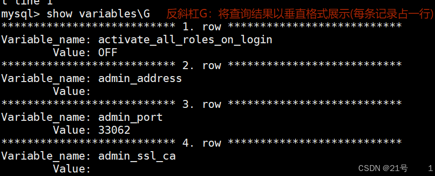 • 系统变量和状态信息也可以使⽤ mysqladmin命令来查看