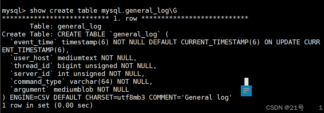 • general_log :⼀般查询⽇志表。