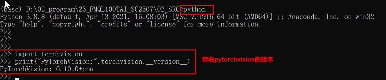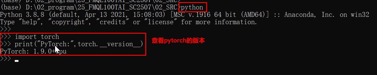 5、进入python环境中查看pytorch的版本,如下所示: