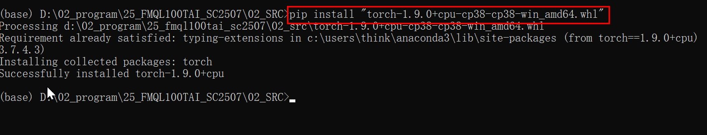 4、使用pip安装pytorch1.9.0的安装包,如下所示: