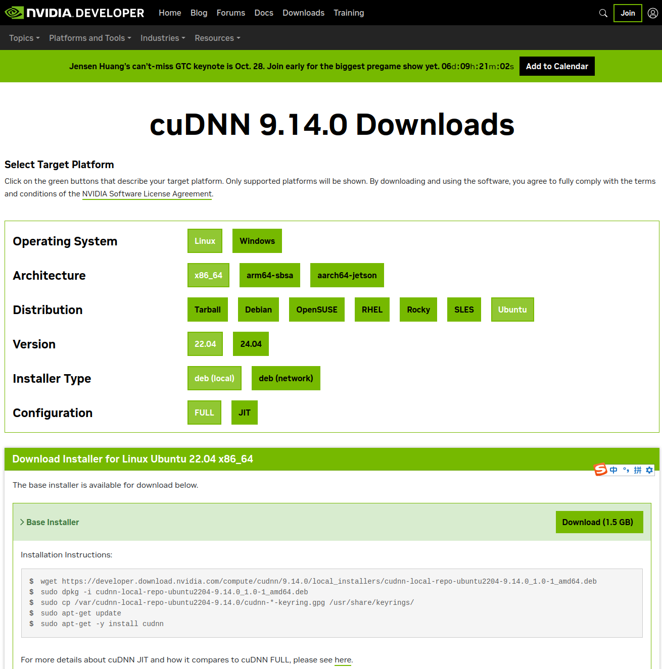 网址:https://developer.nvidia.com/cudnn-downloads?target_os=Linux&target_arch=x86_64&Distribution=Ubuntu&target_version=22.04&target_type=deb_local&Configuration=Full