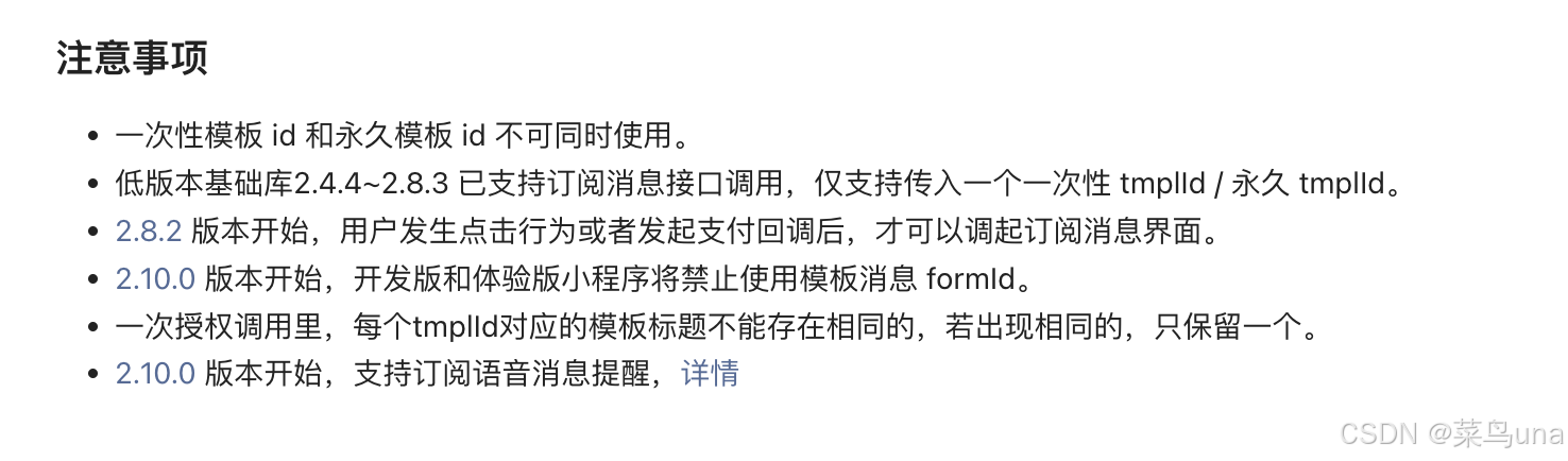 - 多个模板:基础库 2.8.2 版本开始,用户发生点击行为或者发起支付回调后,才可以调起订阅消息界面,且一次调用