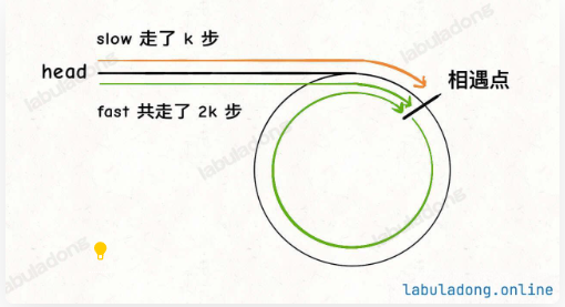 。由于快指针速度是慢指针的 2 倍,因此a + b + k*c = 2*(a + b)