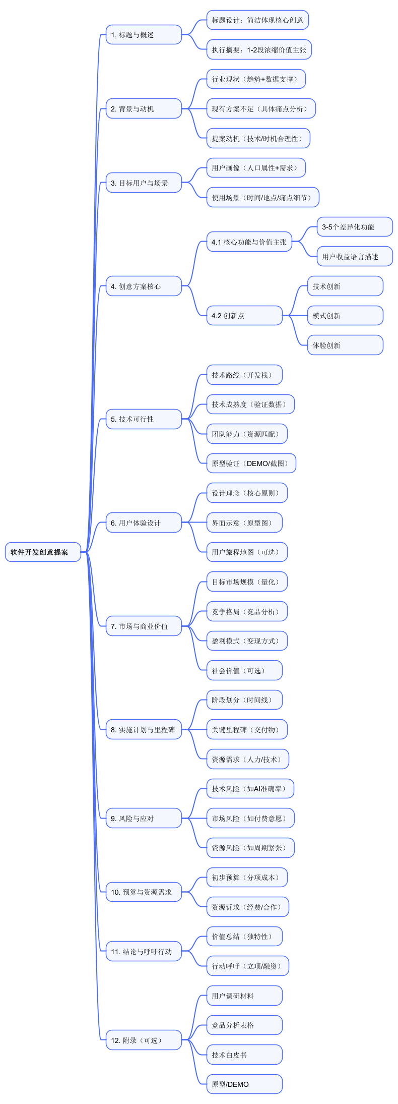 软件开发创意提案的本质是“讲故事”——讲一个“问题真实、方案创新、价值清晰、落地可行”的故事。核心内容包括背景问题、用户场景、创意方案(功能+创新点)、技术可行性、商业价值、实施计划,最终目标是让利益相关者认可:“这个创意值得投入资源,能带来预期回报。”