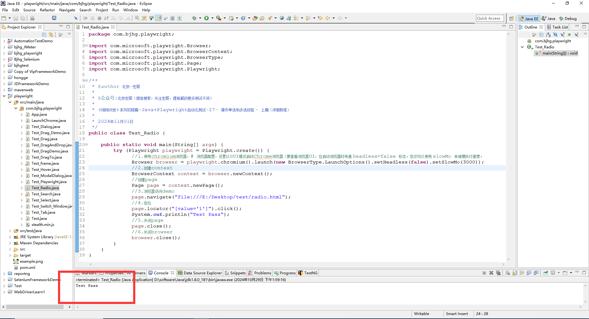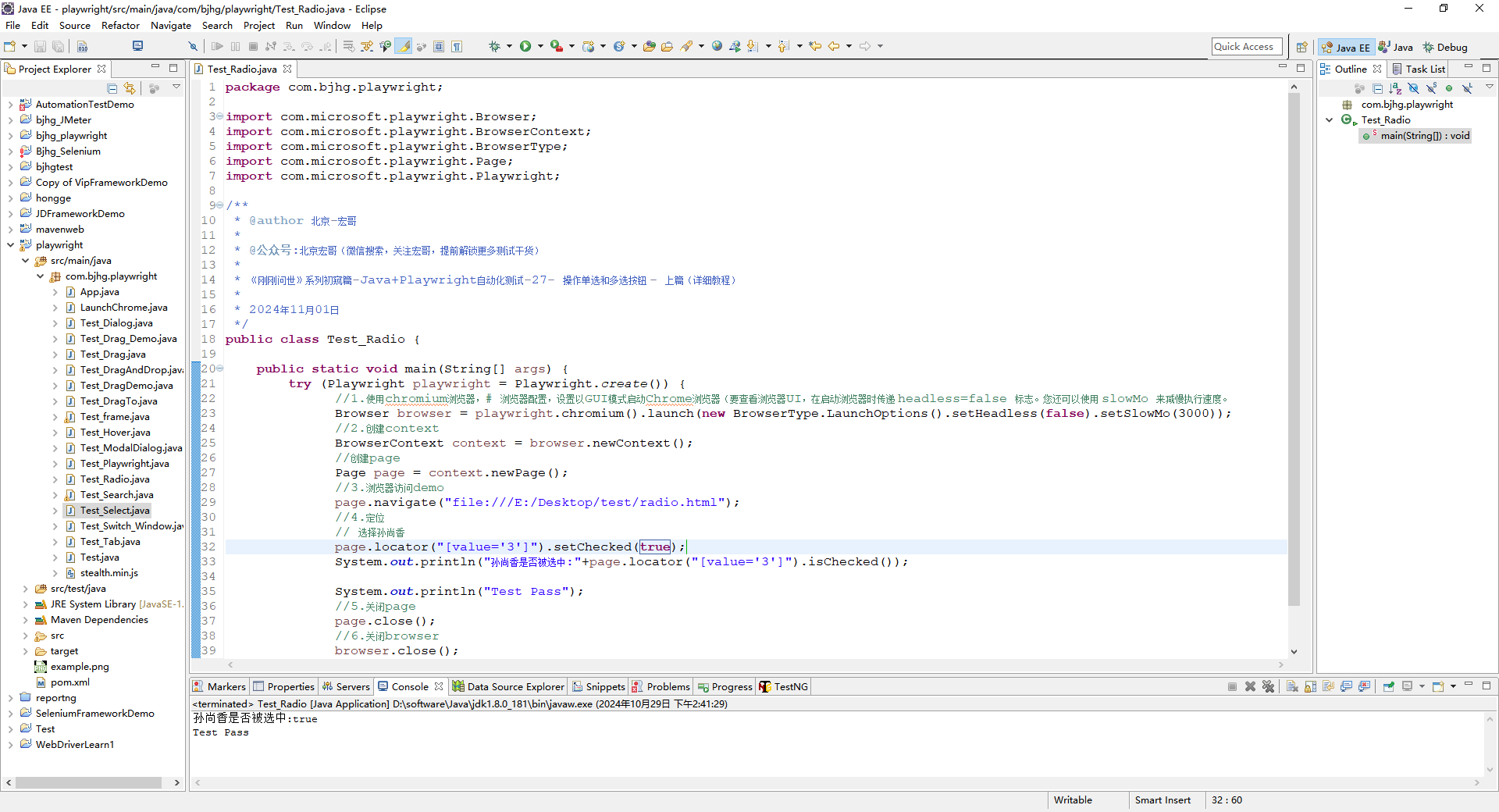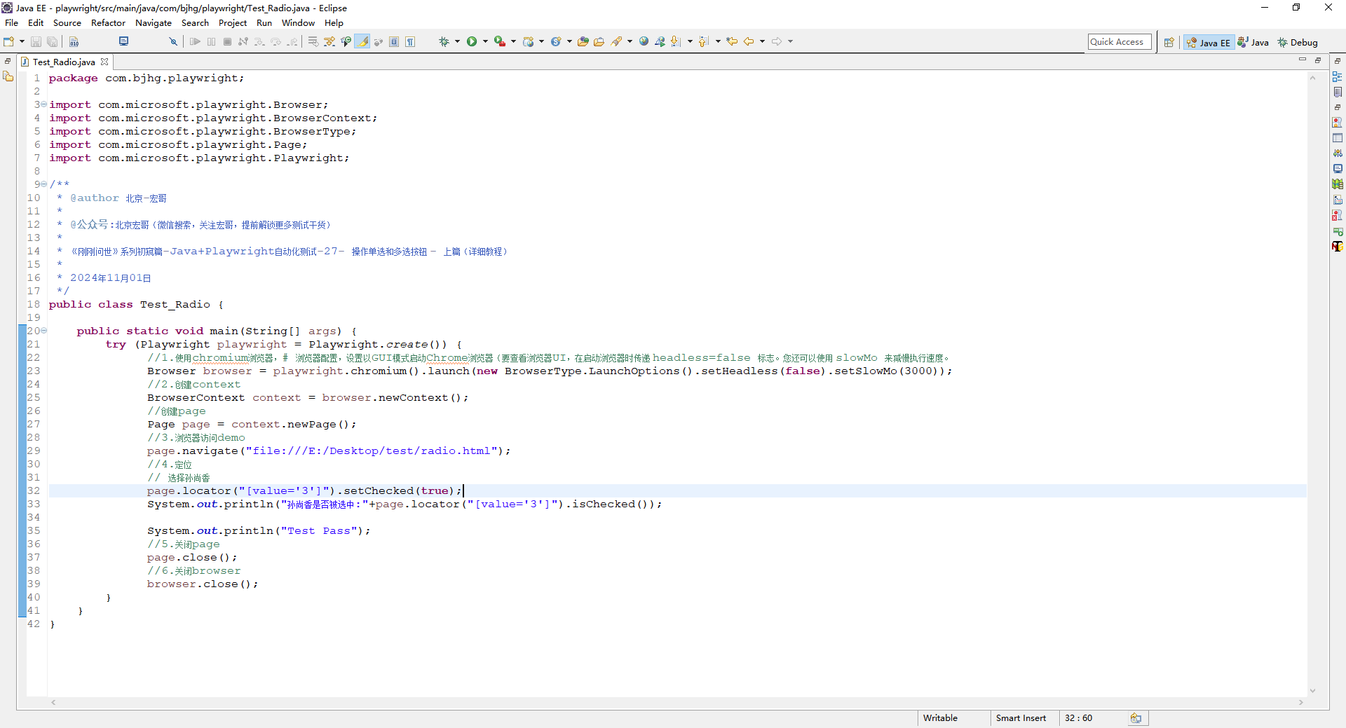 public class Test_Radio {public static void main(String[] args) {try (Playwright playwright = Playwright.create()) {//1.使用chromium浏览器,# 浏览器配置,设置以GUI模式启动Chrome浏览器(要查看浏览器UI,在启动浏览器时传递 headless=false 标志。您还可以使用 slowMo 来减慢执行速度。Browser browser = playwright.chromium().launch(new BrowserType.LaunchOptions().setHeadless(false).setSlowMo(3000));//2.创建contextBrowserContext context = browser.newContext();//创建pagePage page = context.newPage();//3.浏览器访问demopage.navigate("file:///E:/Desktop/test/radio.html");//4.定位page.locator("[value='1']").click();System.out.println("Test Pass");//5.关闭pagepage.close();//6.关闭browserbrowser.close();}}