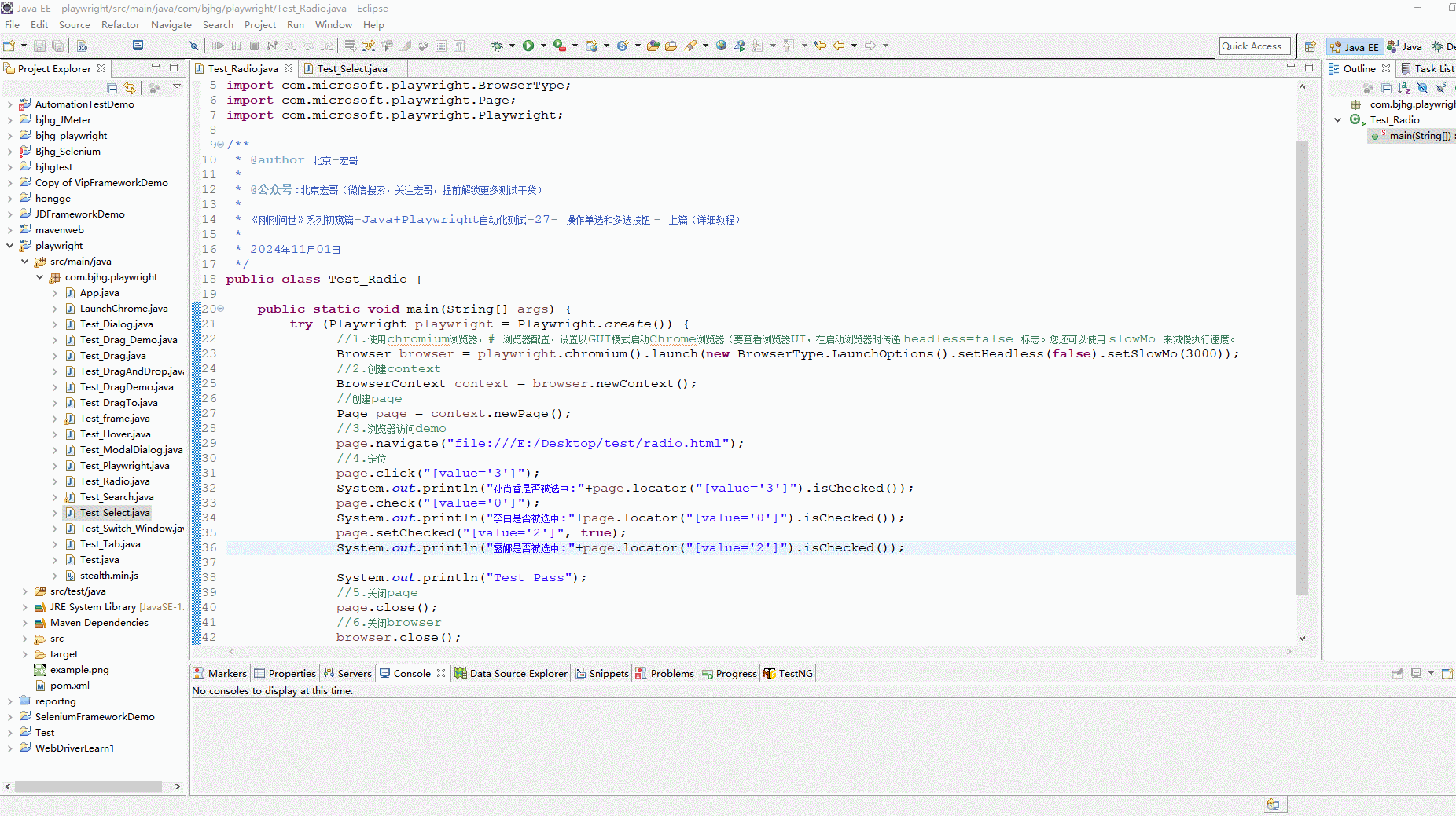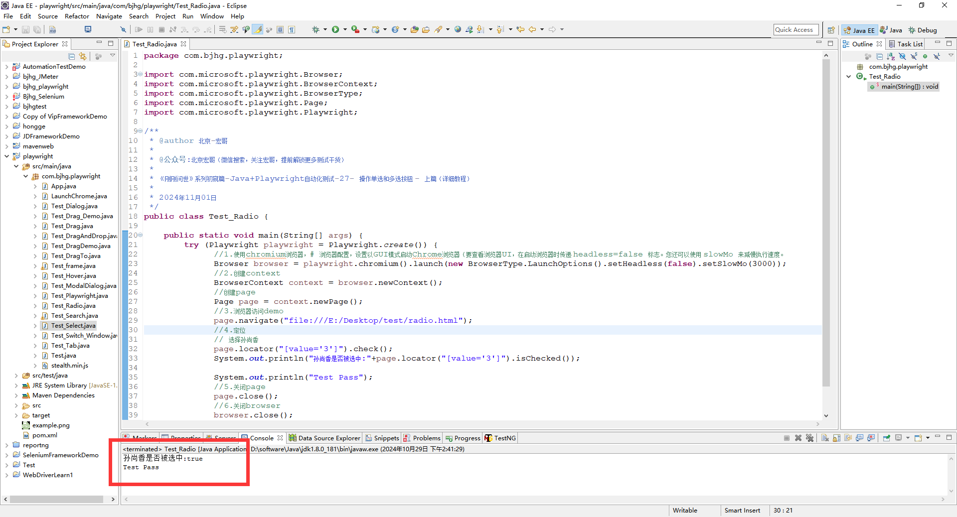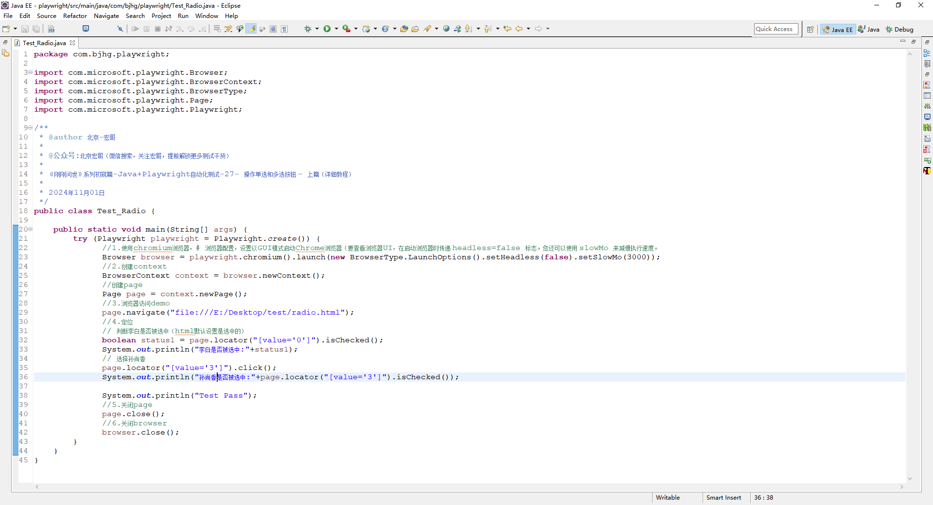 public class Test_Radio {public static void main(String[] args) {try (Playwright playwright = Playwright.create()) {//1.使用chromium浏览器,# 浏览器配置,设置以GUI模式启动Chrome浏览器(要查看浏览器UI,在启动浏览器时传递 headless=false 标志。您还可以使用 slowMo 来减慢执行速度。Browser browser = playwright.chromium().launch(new BrowserType.LaunchOptions().setHeadless(false).setSlowMo(3000));//2.创建contextBrowserContext context = browser.newContext();//创建pagePage page = context.newPage();//3.浏览器访问demopage.navigate("file:///E:/Desktop/test/radio.html");//4.定位page.locator("[value='1']").click();System.out.println("Test Pass");//5.关闭pagepage.close();//6.关闭browserbrowser.close();}}