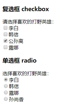 <body><button class="button1"><a id="myAnchor" href="https://www.cnblogs.com/du-hong/">北京-宏哥</a></button></br><div id="hg"><div><h3>复选框 checkbox</h3> 请选择喜欢的打野英雄:<br><label><input name="checkbox1" type="checkbox" value="李白"/>李白 </label><br><label><input name="checkbox2" type="checkbox" value="韩信"/>韩信 </label><br><label><input name="checkbox3" type="checkbox" value="公孙离" checked="checked"/>公孙离 </label><br><label><input name="checkbox4" type="checkbox" value="露娜"/>露娜 </label><br></div><div><h3>单选框 radio</h3> 选择喜欢的打野英雄:<br><label><input name="radio" type="radio" value="0" checked="checked"/>李白 </label><br><label><input name="radio" type="radio" value="1"/>韩信 </label><br><label><input name="radio" type="radio" value="2"/>露娜 </label><br><label><input name="radio" type="radio" value="3"/>孙尚香 </label><br></div></div>