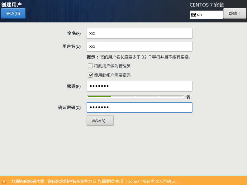 用户的强密码。 - 点击 “完成(Done)”。若密码较弱,可点击两次 “完成(Done)” 强制使用。