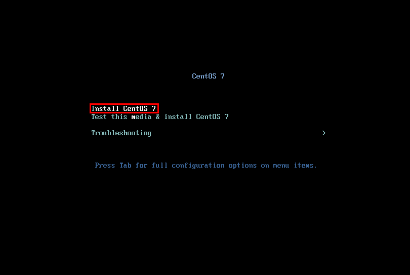 - 在启动菜单中,使用键盘上下键选择 “Install CentOS 7”,然后按