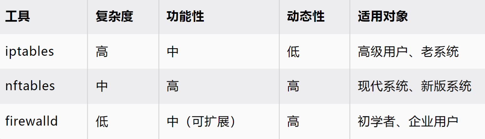 - 支持图形化界面(firewall-config)和命令行工具(firewall-cmd)