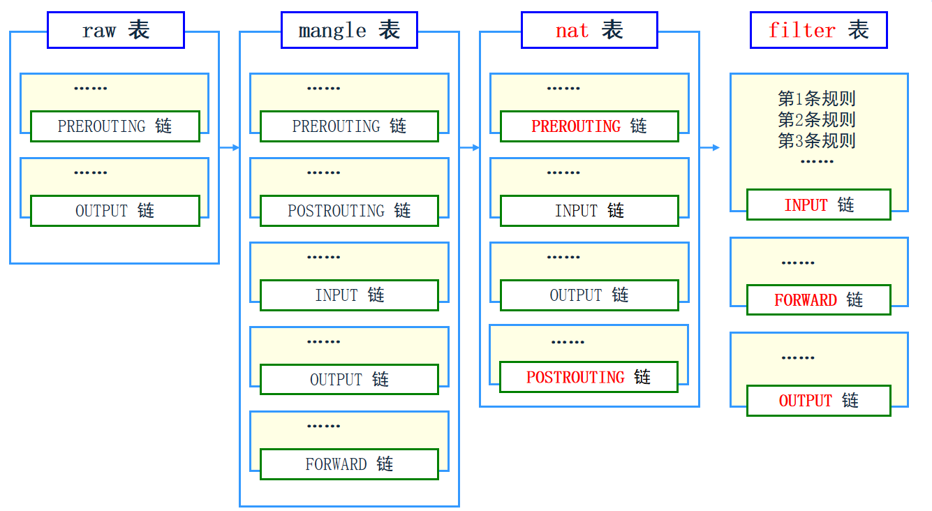 - 每个表定义了不同的功能,而每个链决定了数据包在特定阶段的处理方式