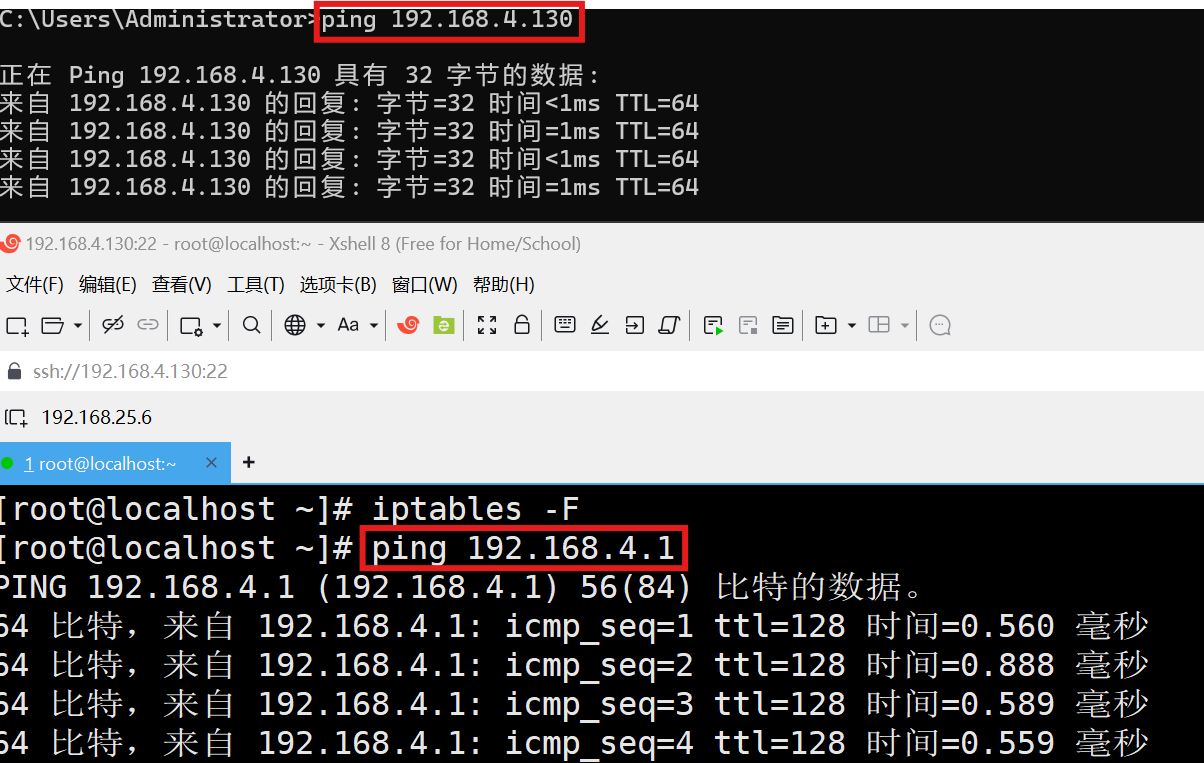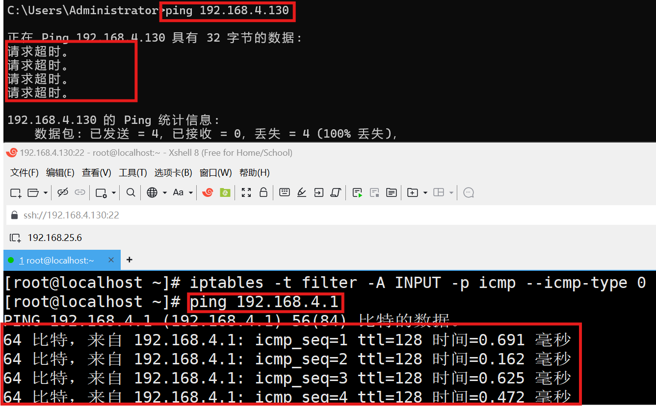 [root@localhost ~]# iptables -A INPUT -s 192.168.4.1 -j DROP