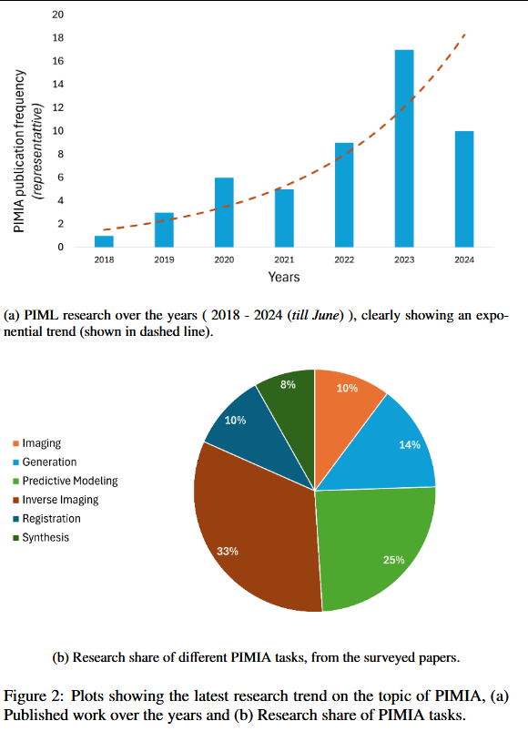 近期 PIMIA 文献呈指数级增长趋势,仅过去 7 年便涌现出大量相关研究,见图 2a。配套的饼图展示了各 PIMIA 任务的研究占比,清晰显示逆成像(尤其是图像重建)与预测建模等任务在物理信息融合方面受到最多关注。