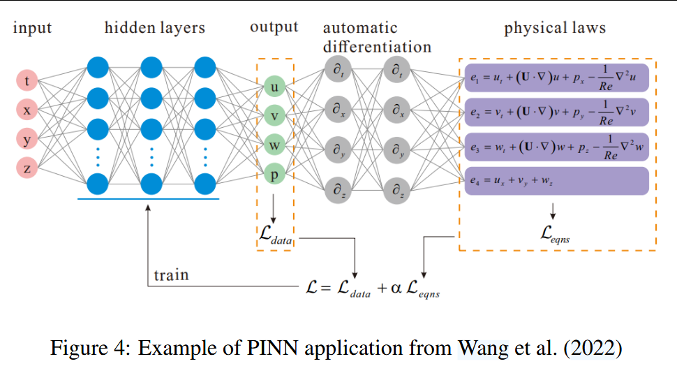 接下来,我们讨论 Wang 等人(2022年)在流体力学领域的工作,展示如何利用 PINN 从稀疏数据中提升速度场的测量精度。在该研究中,通过最小化基于稀疏数据和 Navier-Stokes 偏微分方程的损失函数,PINN(见图4)重建了高密度的速度场并预测了压力,显著提高了流动可视化和分析的分辨率和准确性。该 PINN 由神经网络 NN(X, t; θ) 定义,网络同时近似速度场 U = (u, v, w) 和压力 p。用于训练该 PINN 的损失函数 L 如下:
