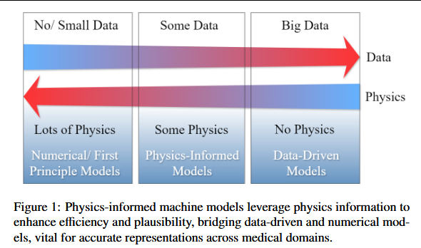 物理方程与数学模型能以简化的类比方式,帮助我们理解人体解剖结构内部的物理过程以及成像的生理机制,从而为医学影像分析任务提供宝贵洞见——尽管它们并不能完全还原这些系统的真实复杂度。例如:将血流建模为非牛顿流体(Toghraie 等,2020);以 Navier–Stokes 方程作为基础物理模型来理解与模拟心血管血流动力学(Li 等,2021)。此外,医学图像的采集过程本身也可表述为微分方程、边界条件与约束:CT 灌注扫描的动力学(de Vries 等,2023);MRI 图像采集的物理原理(Borges 等,2024);MRI 硬件限制(Peng 等,2022)。基于基本方程与领域知识的物理方法,通过体现真实的物理关系,有望提高可靠性与系统安全性(Balageas 等,2010;Hu 等,2019)。因此,医学影像分析亟需一场范式转变——将物理定律纳入其中。