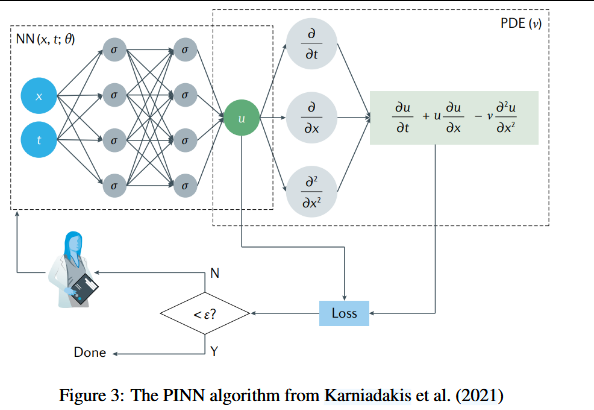这一优化过程确保了神经网络解 NN(X, t; θ) 既能拟合观测数据,又能遵守由偏微分方程(PDE)描述的底层物理规律。该算法将迭代运行,直到损失值低于某个设定的阈值 ε(ε 为正数),或由人工操作者终止。
