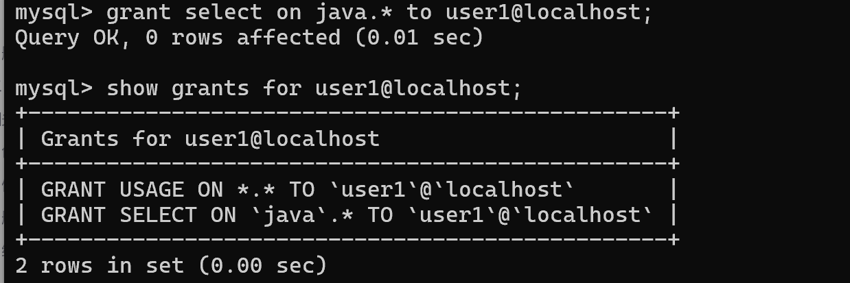 grant all on java.* to user1@localhost; 授权用户“user1@localhost” java库的所有权限