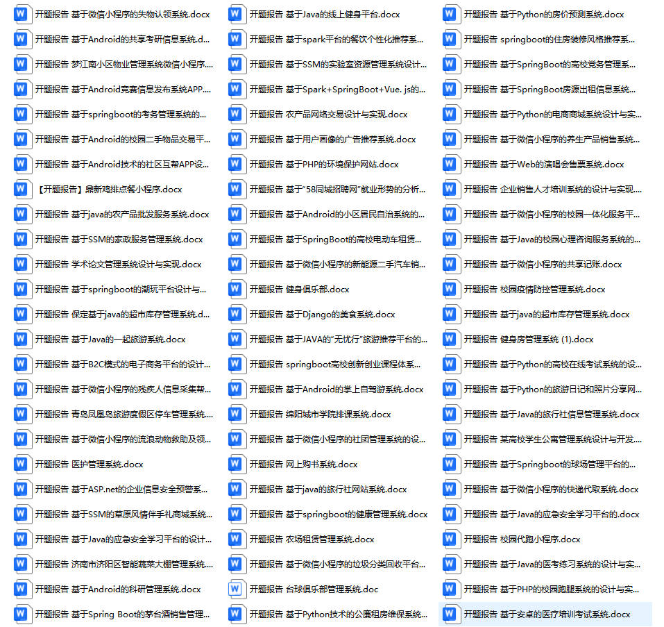 以上是某同学的毕业设计答辩的过程,如果你现在还没有参加答辩,还是开题阶段,已经选好了题目不知道怎么写开题报告,可以下面找找有没有自己符合自己题目的开题报告内容,列表中的开题报告都是往届真实的开题报告,可发送使用或参考。文末或底部来联xi可免费获取