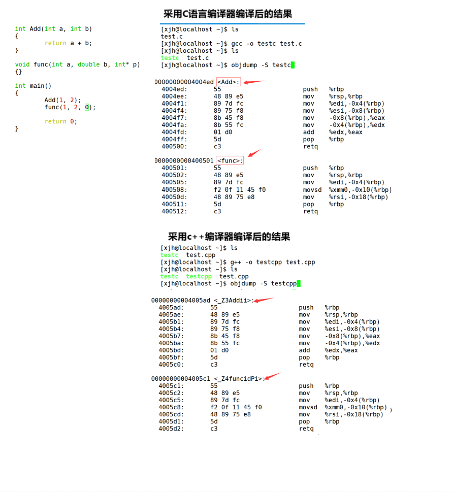 结论2 (采用c++编译器): 在 linux 下,采用 g++ 编译完成后,函数名字的修饰发生改变,编译器将函数参数、类型信息添加到修改后的名字中。