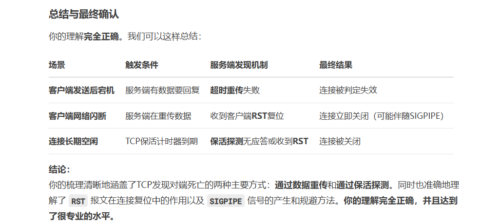 还有一种情况就是我们的客户端断网前发送一个请求,然后它断网,断网后它又恢复了,这个时候我们的客户端会接收到我们的服务端的回复,但是这个时候连接是没有建立的,在连接没有建立的情况下,我们的客户端会给我们的服务端发送RST,然后我们的操作系统检测到我们的服务端在向一个错误的连接里面进行写入,会发送信号干掉我们的服务端,为了防止被干掉,我们捕捉到这个信号。