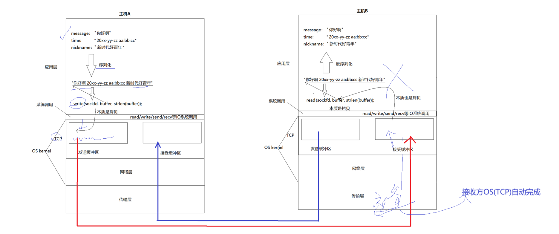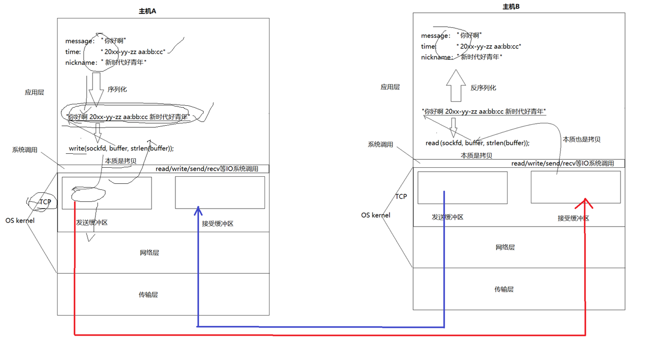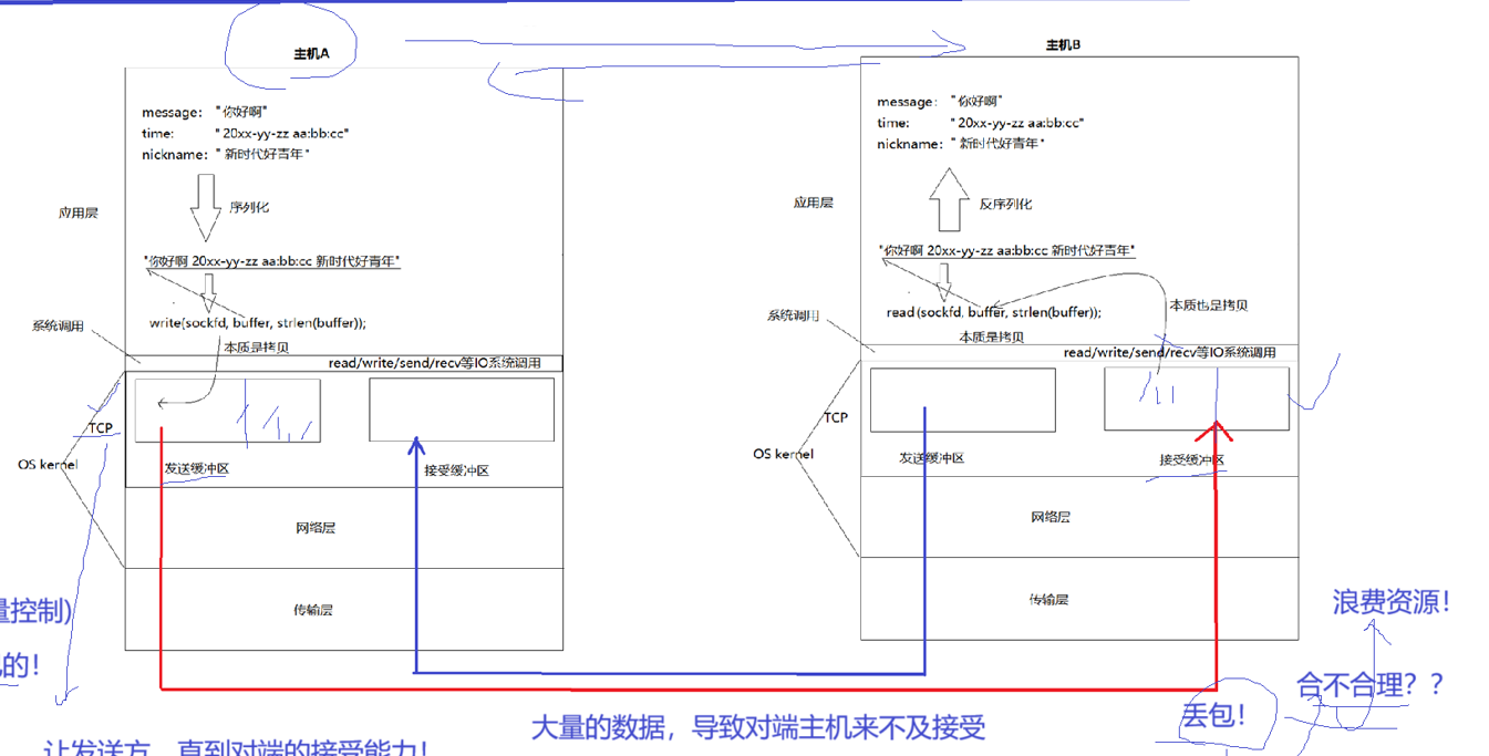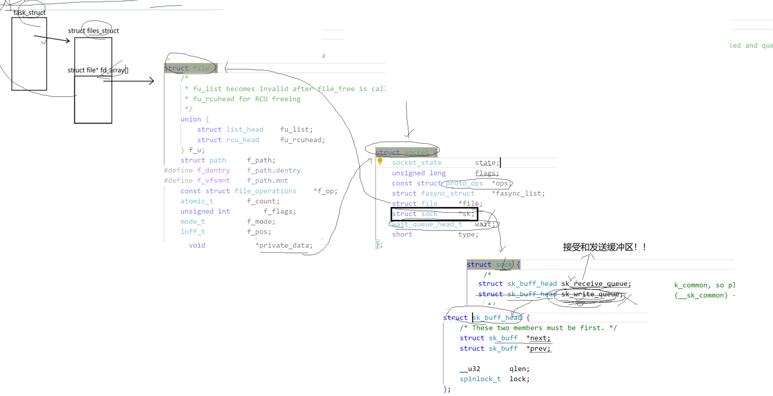我们下图中的发送缓冲区和接受缓冲区就可以通过我们进程打开的文件,文件里的套接字文件找到我们的缓冲区,缓冲区就是一个队列,队列里面有我们的发送的报文,和接受的报文,至此我们的系统和我们的网络进行了串联!!!