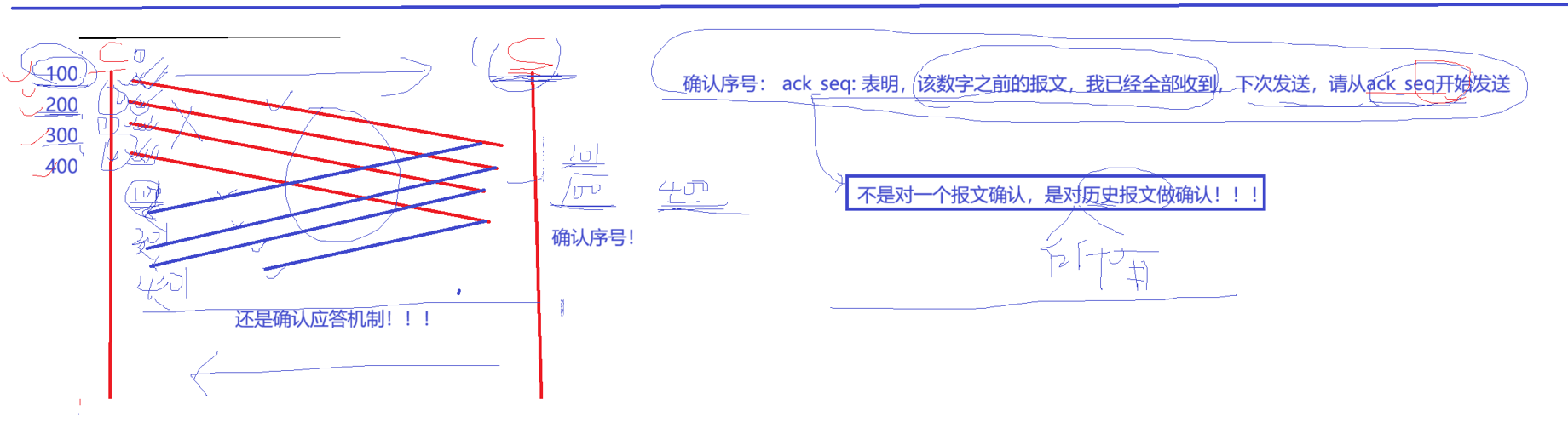 而我们的报文里的报头除了有我们的序号保证发送的报文顺序之外,还有我们的确认序号,确认序号的意思是,该序号之前的报文我已经全部收到了,下次发送,请从确认序号开始发送,这个不是对一个报文的确认,这个是对历史所有报文的确认,比如我发送1000-5000,1000-2000,3000-5000全部正确发送,但是我们的2000-3000丢包了,那么我们发送过来的应答就一直是2001,表面2001序号之前的报文全部收到了,当我们的客户端连续接收到一样的确认序号之后,就会对我们的2000-3000数据进行补发。