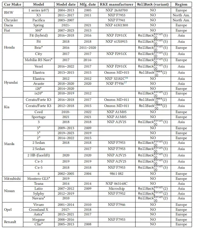 最后一列表明车辆(更准确地说是远程无钥匙进入系统)是否易受 RollBack 攻击(若易受攻击,则标注有效的 RollBack 攻击变体)。