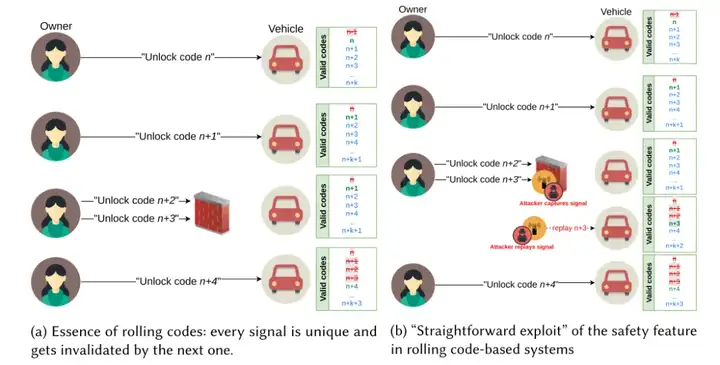 图1、(a) 滚动码技术核心:每个信号都是唯一的,且会被下一个信号作废;(b) 对滚动码系统安全机制的 “直接利用”