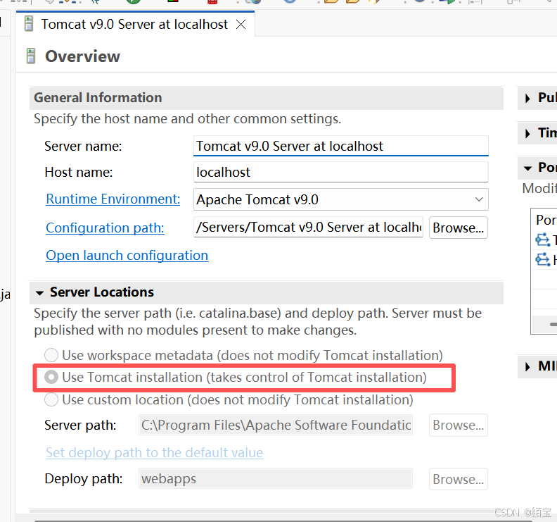 双击你的Tomcat服务器,或右键选择"Open",打开服务器配置界面。在Server Locations区域,选择 Use Tomcat installation (takes control of Tomcat installation) 。