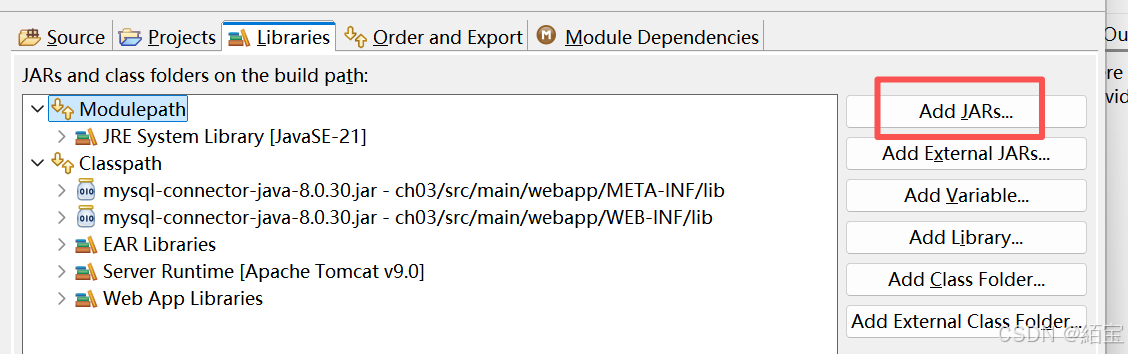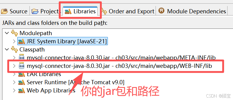 查看 Libraries 选项卡,确认所需的JAR包是否在此列出。如果不在,你需要通过"Add JARs"或"Add External JARs"添加。【如图】