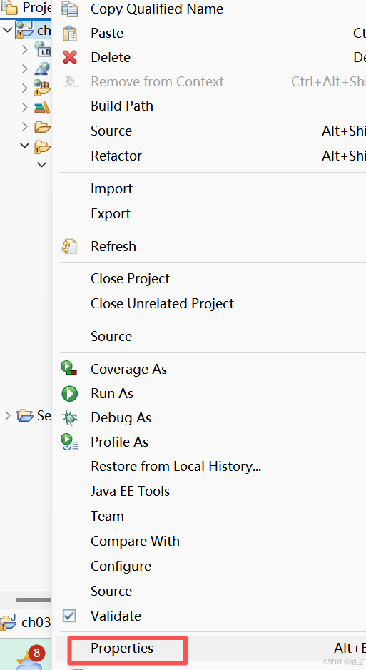 在项目上右键,选择 Properties > Java Build Path。【如图】