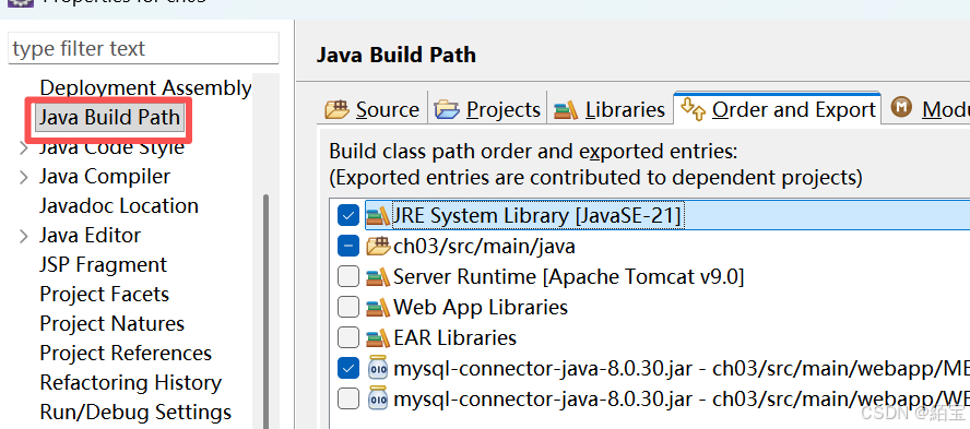 在项目属性的 Deployment Assembly 中,确保项目依赖的JAR包(包括那些通过构建路径添加的)都被配置为会部署到WEB-INF/lib