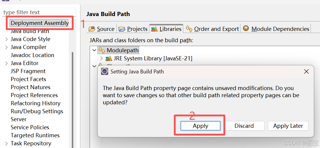 项目属性还是在这【如下图左侧所示】。再点击下图右侧1的位置,会有一个弹窗点apply即可。