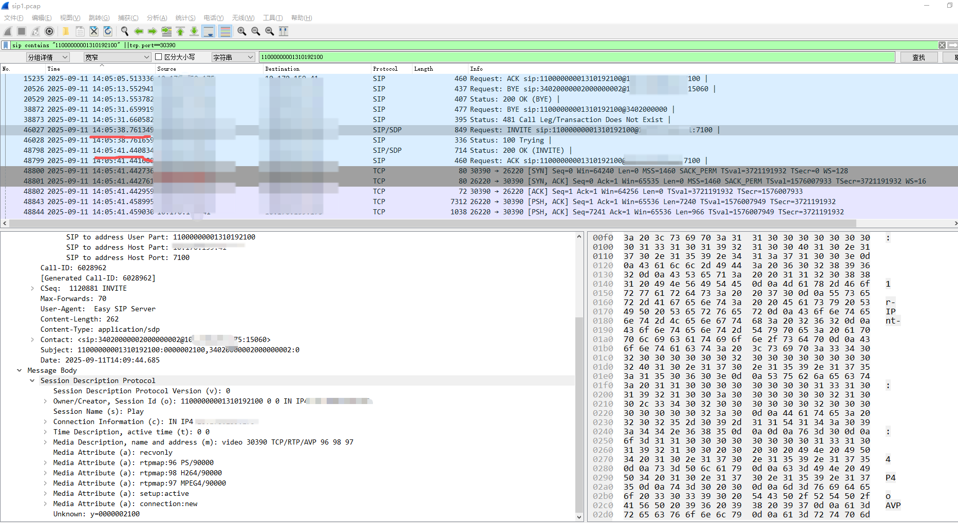 由于问题偶发且无明确报错,我们优先通过抓包工具对级联交互的信令和流数据进行全量记录,重点关注播放请求的完整流程(GB28181播放流程:INVITE->200 OK->ACK->流传输)。