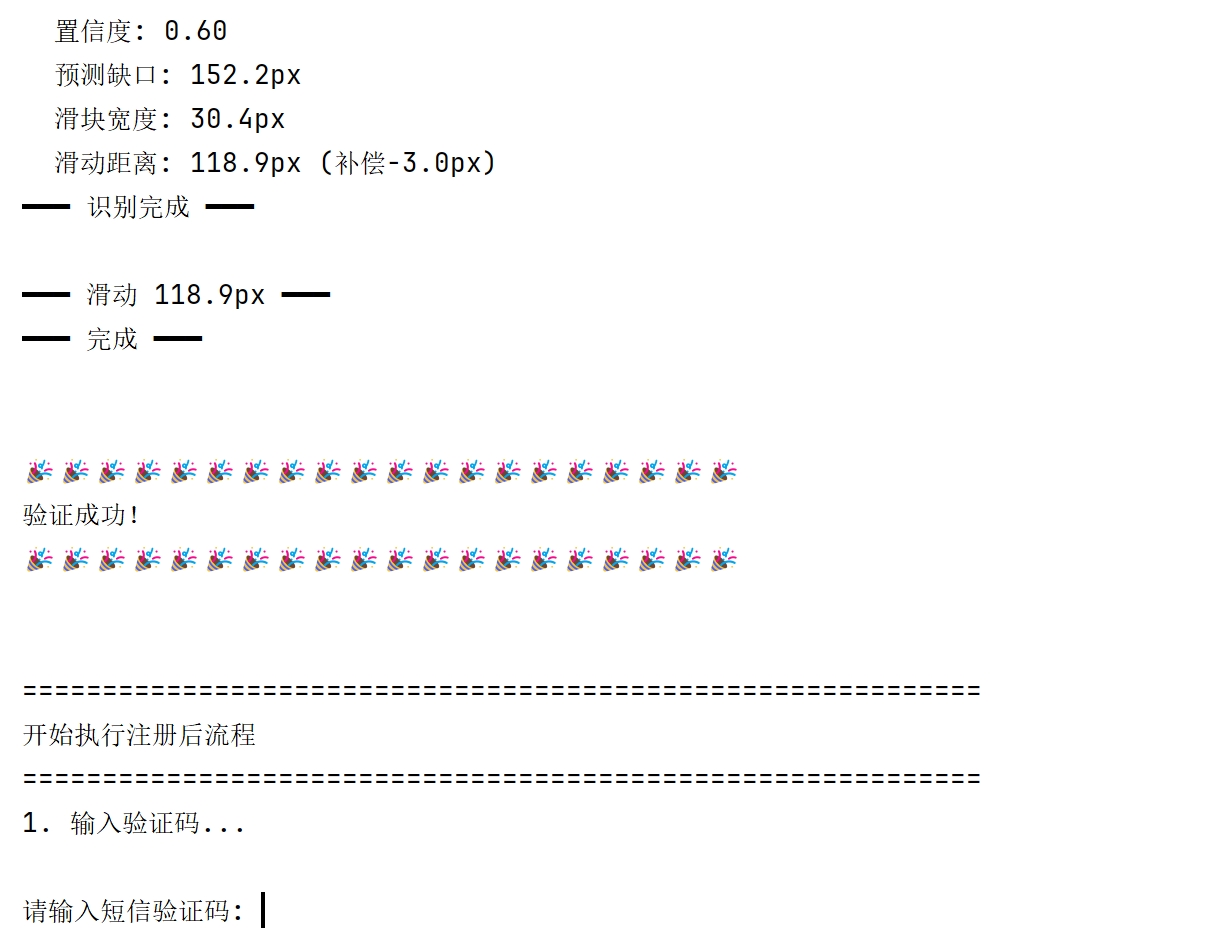 async def complete_registration_process(page):"""完成注册后的所有操作"""# 1. 输入短信验证码# 2. 点击登录按钮# 3. 设置随机用户名# 4. 进入账户中心# 5. 设置登录密码# ... 完整流程见代码