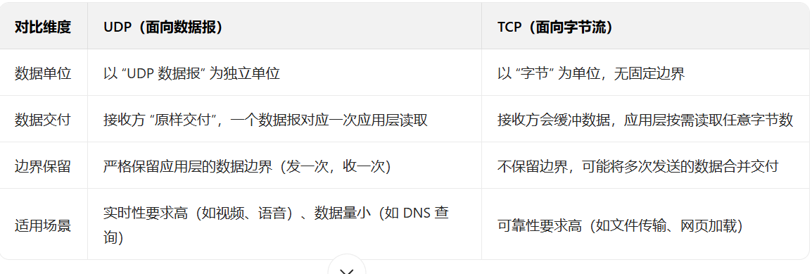 边界保留:UDP将数据拆分为一个个数据报,接收方读取数据的时候只能一个一个的读取数据报,无法读取某一部分或者将数据报的内容合并读取,好处是可以知道这些数据报对应着发送方的第几次发送。