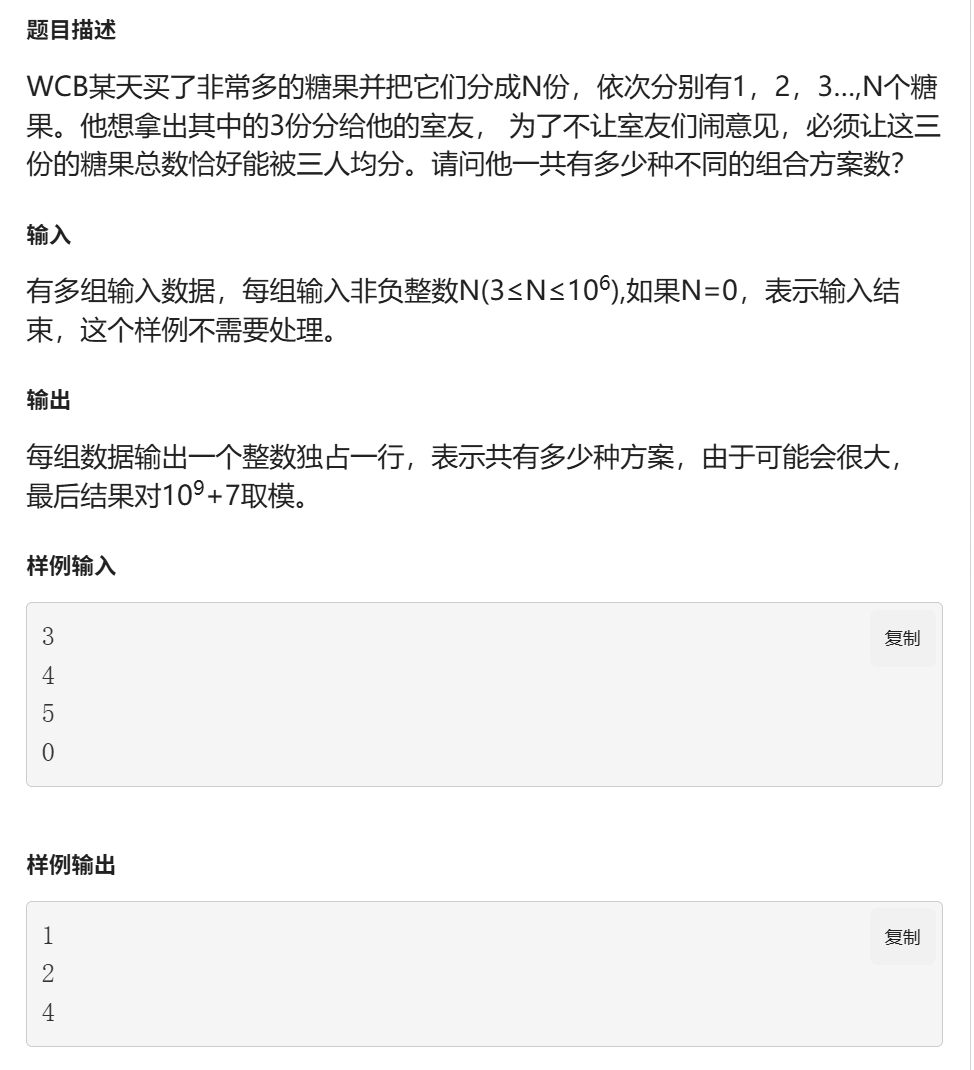 #define ll long longint main() {ll N;while (scanf("%lld", &N) && N != 0) {ll c0 = N / 3;ll c1 = (N + 2) / 3;ll c2 = (N + 1) / 3;// 直接计算所有情况,避免复杂的组合数函数ll ans = 0;// 情况1:三个数都模3余0if (c0 >= 3) ans = (ans + c0 * (c0 - 1) * (c0 - 2) / 6) % MOD;// 情况2:三个数都模3余1if (c1 >= 3) ans = (ans + c1 * (c1 - 1) * (c1 - 2) / 6) % MOD;// 情况3:三个数都模3余2if (c2 >= 3) ans = (ans + c2 * (c2 - 1) * (c2 - 2) / 6) % MOD;// 情况4:三个数余数各不相同ans = (ans + c0 * c1 % MOD * c2 % MOD) % MOD;printf("%lld\n", ans);}return 0;
