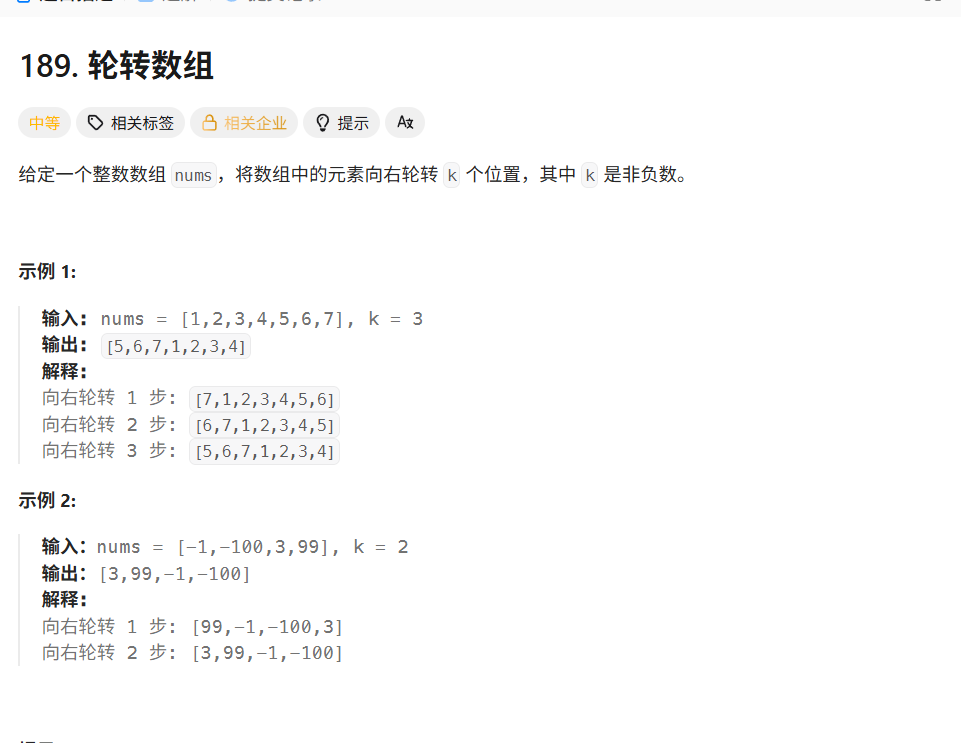 首先,关于这道题的理解,当k<n的时候,也就是题目描述中给出的那些情况,将后半段和前半段分别存储到一个第三方空间中,再分别复制到nums数组中。当k>n的时候,k=k%n,他是这么算的,这个题目中也没有明说,感觉要是这点他明说的话,可以省去好多时间。