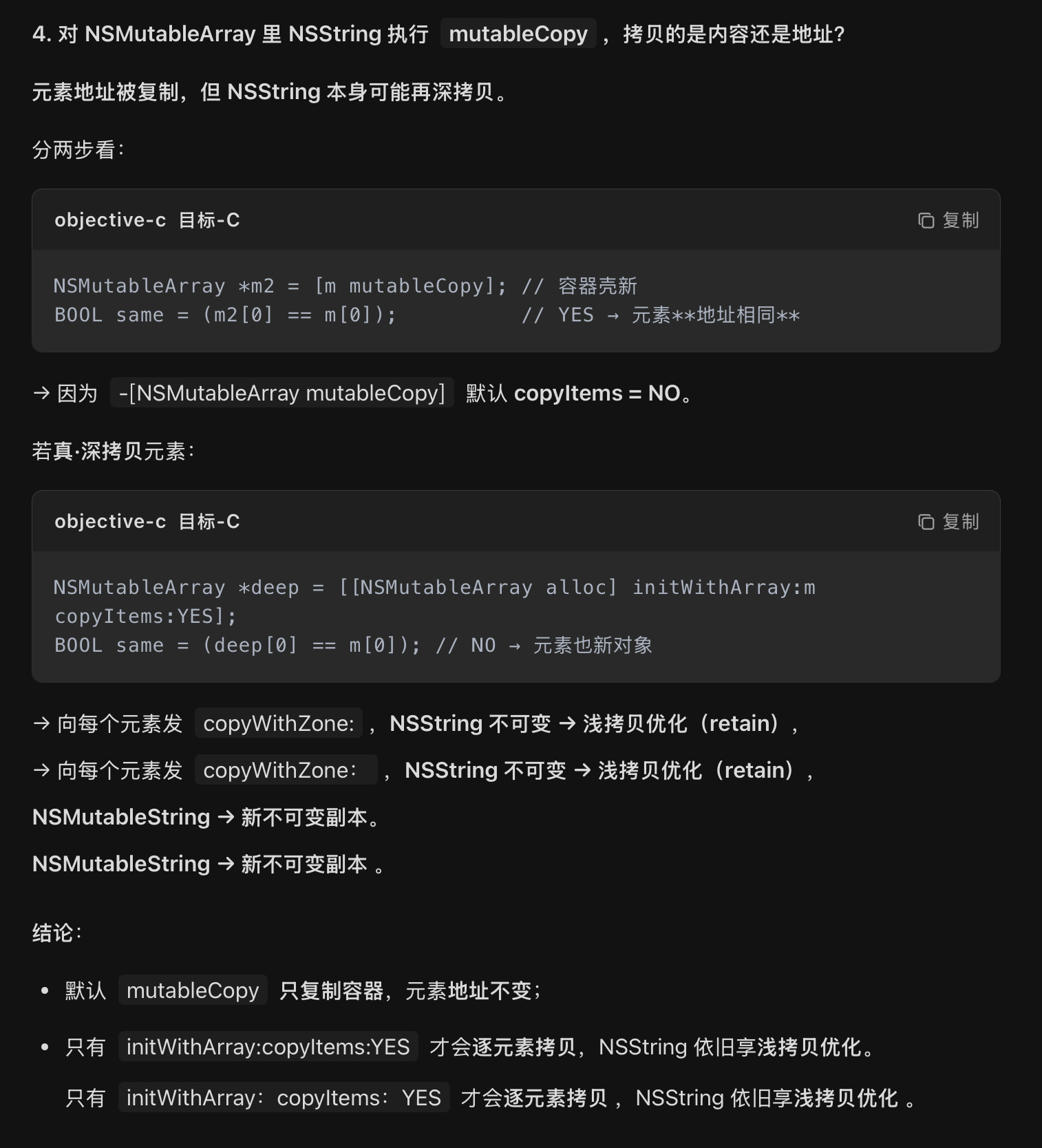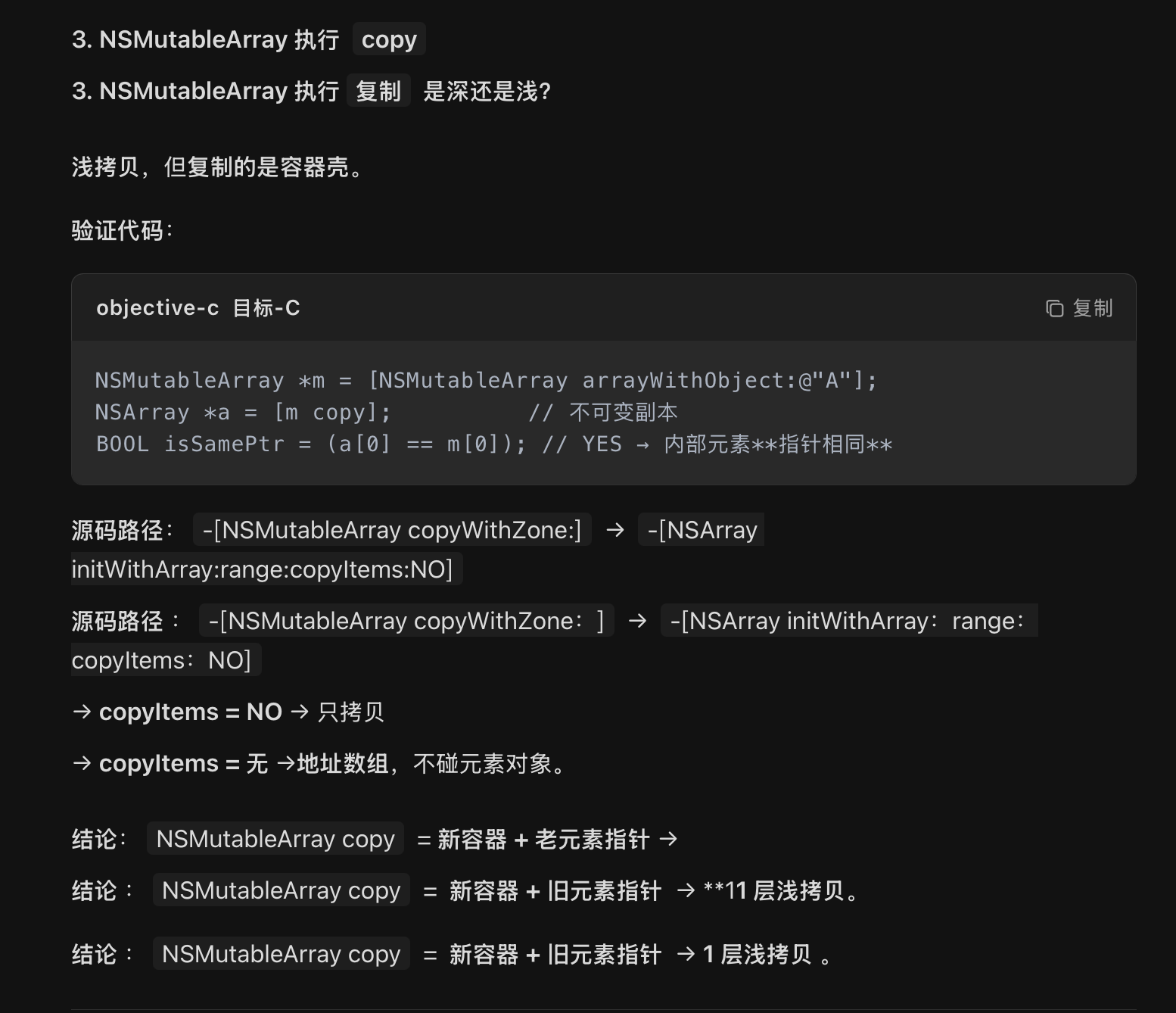 接下来,我们转向NSArray和NSMutableArray这两种容器对象。与非容器对象不同,容器对象的拷贝涉及到更复杂的操作。为了确保在改变副本时不会影响到原内容,我们需要进行深层次的拷贝。这种深拷贝方式会递归地复制容器对象中的所有元素,从而生成一个与原容器对象完全独立的新容器对象。