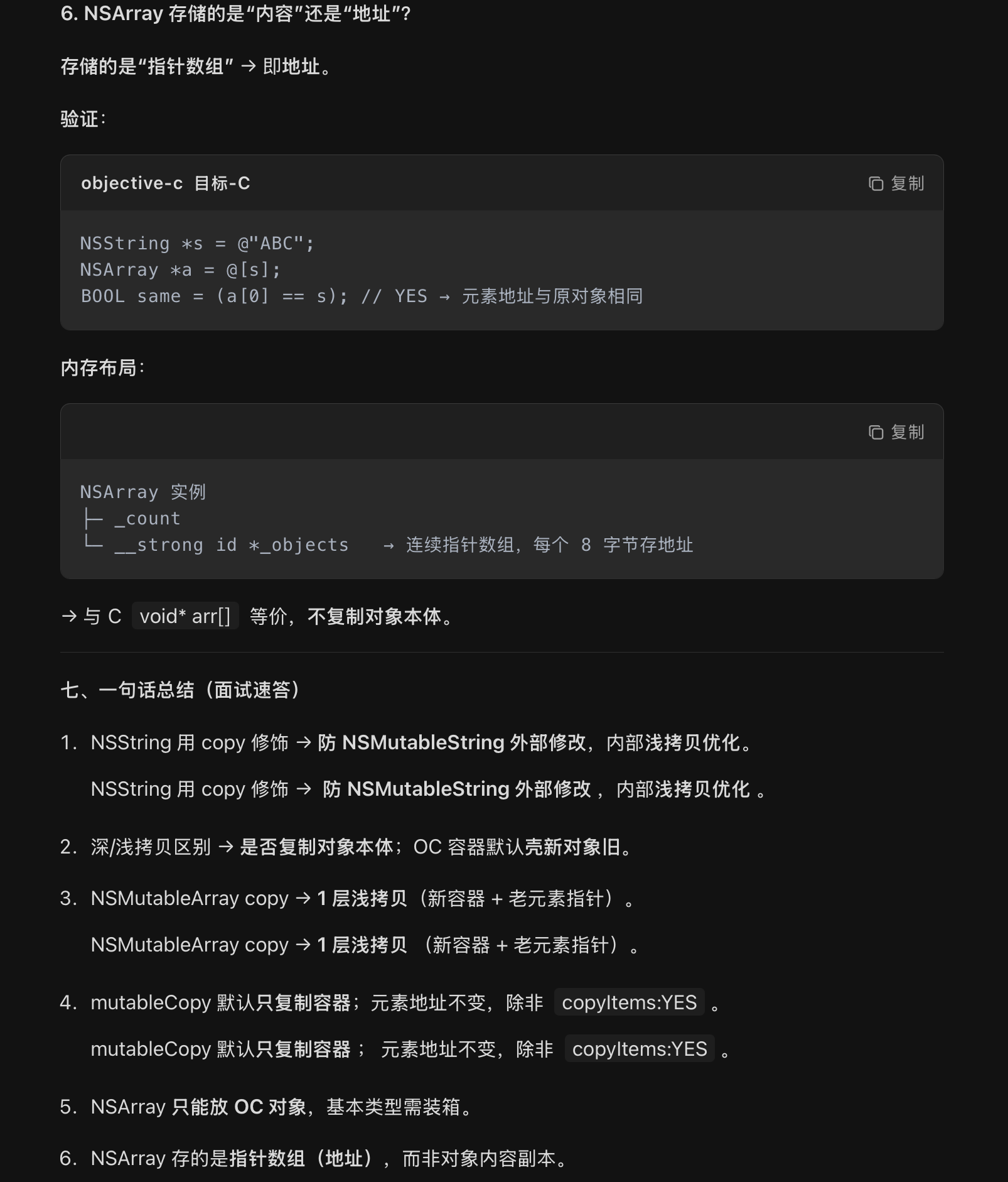 NSString为什么copy修饰?深拷贝和浅拷贝的区别?NSMutableArray进行copy是深拷贝还是浅拷贝?NSMutablearray里的内容如果是NSString,那么mutablecopy的话是拷贝的内容还是内容地址都拷贝?NSArray的内容是OC对象还是其他的对象,是否可以是非OC对象?nsarray存储的是内容还是地址?下面针对上面的问题一一分析。