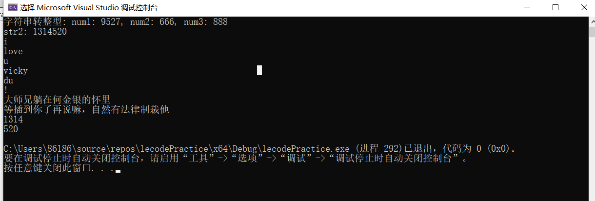 void testStringStream(void) {// 字符串转整型(可以转多个整型)std::string str = "9527 666 888";std::stringstream ss1(str); // 字符串流,支持双向操作int num1, num2, num3;ss1 >> num1 >> num2 >> num3; // 提取std::cout << "字符串转整型: " << "num1: " << num1 << ", num2: " << num2 << ", num3: " << num3 << std::endl;// 数字转字符串std::stringstream ss2;ss2 << 1314 << 520; // 插入std::string str2 = ss2.str();std::cout << "str2: " << str2 << std::endl; // 打印str2: 1314520// 字符串按空格分割std::string str3 = "i love u vicky du !";std::stringstream ss3(str3);std::string w;for (;ss3 >> w;) {std::cout << w << std::endl;}// 字符串自定义符号分割std::stringstream ss4("大师兄躺在何金银的怀里;等插到你了再说嘛,自然有法律制裁他");std::string s;for (;std::getline(ss4, s, ';');) {std::cout << s << std::endl;}// fail函数检查是否提取成功std::stringstream ss5("1314 520 爱你一万年 1314520");int a = 0;for (;;) { // 循环提取到1314、 520ss5 >> a;if (ss5.fail()) break;std::cout << a << std::endl;}// 可以清空后复用ss5.str("");ss5.clear();// ...