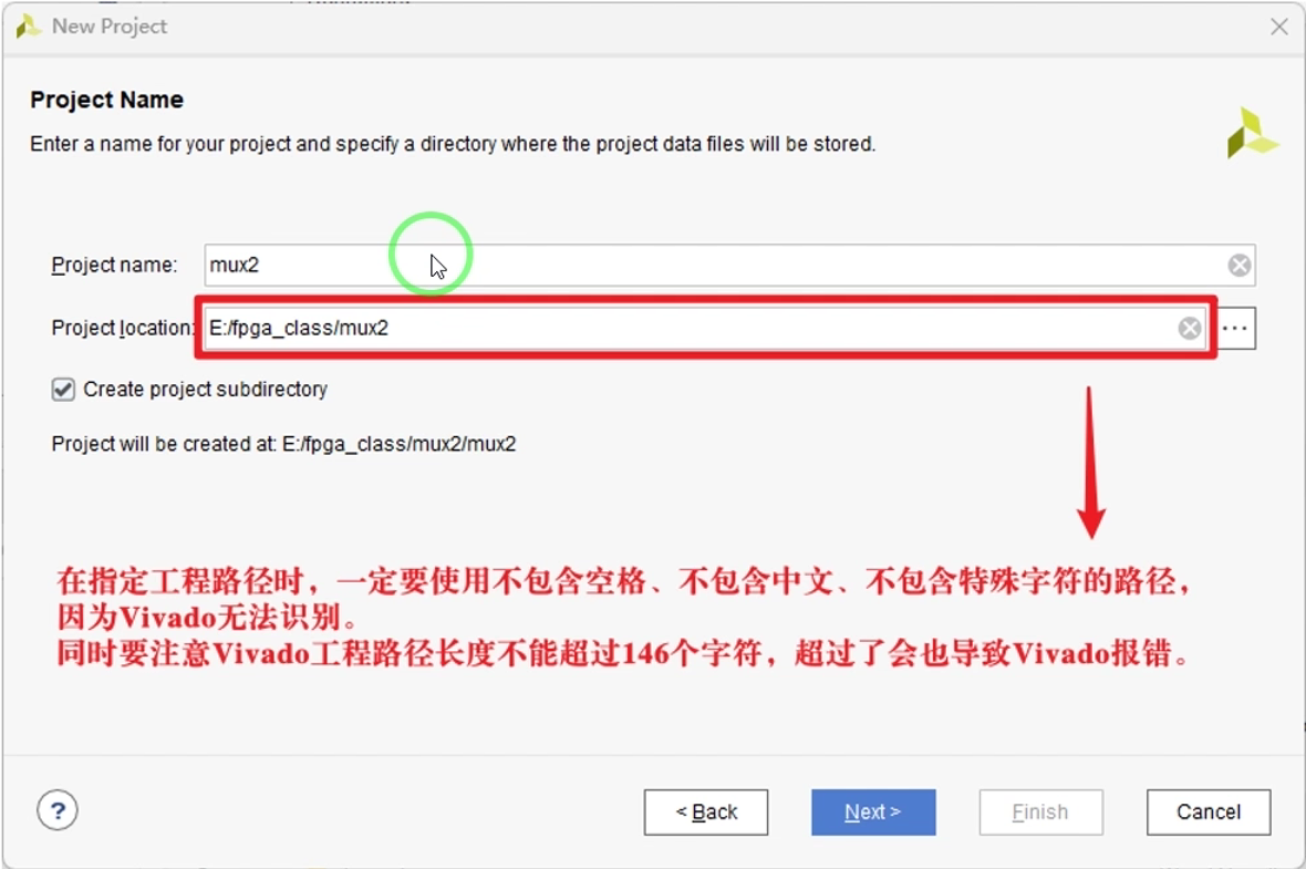 第二页是输入工程名称Project name,取名时最好有一定的实际意义,这里的mux2是二选一多路器,它是FPGA中最简单的电路模型,Project location是存放工程文件的路径,勾选Create project subdirectory选项,软件就会在指定的Project location位置的文件夹下新建一个和Project name一样的文件夹。
