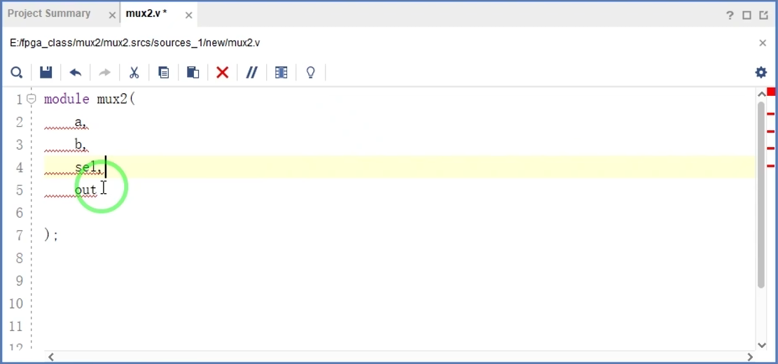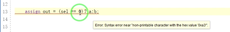 提示:Vivado团建的代码编译器本身的自带有语法检测功能,会用红色波浪线标注出有语法错误的代码,一般出现无法打印的字符就说明代码中含有中文字符