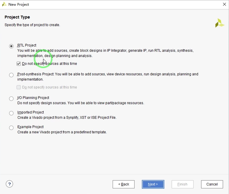 第三页是选择创建的工程类型,选择第一个RTL Project即可。