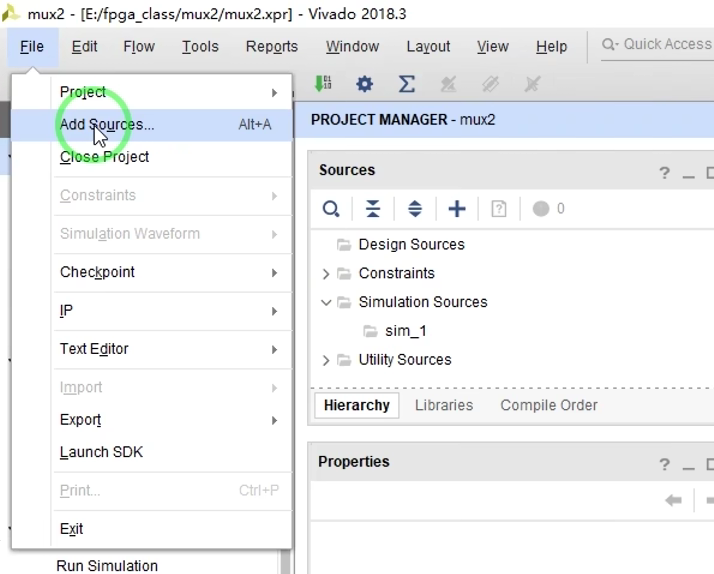点击File→Add Sources或者直接在主界面使用 Alt+A 的快捷键即可调出创建设计源文件的选项卡。