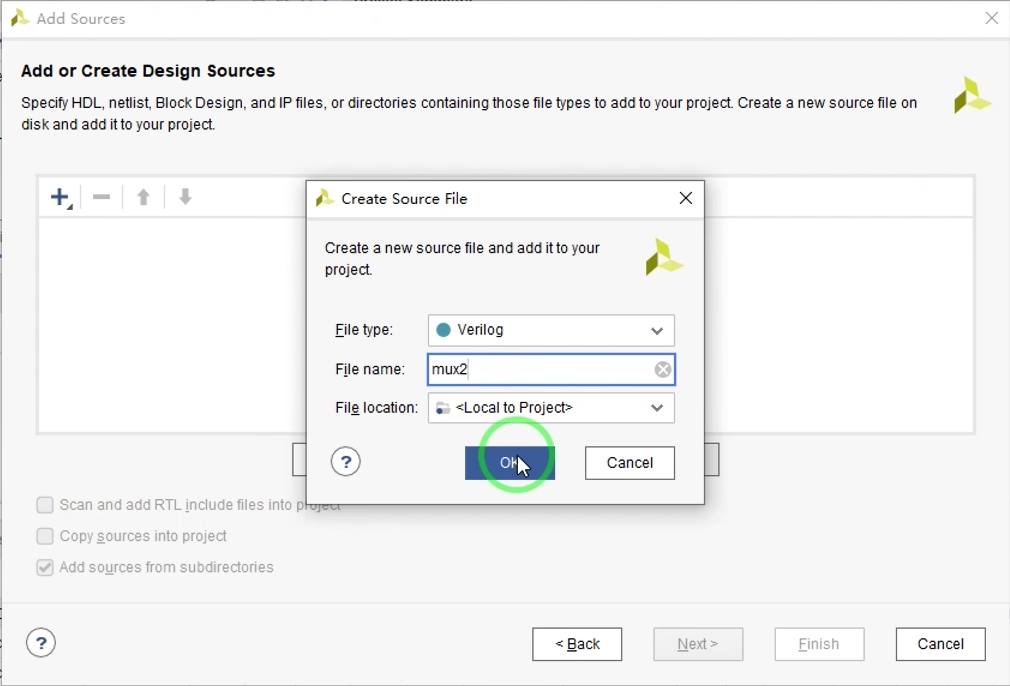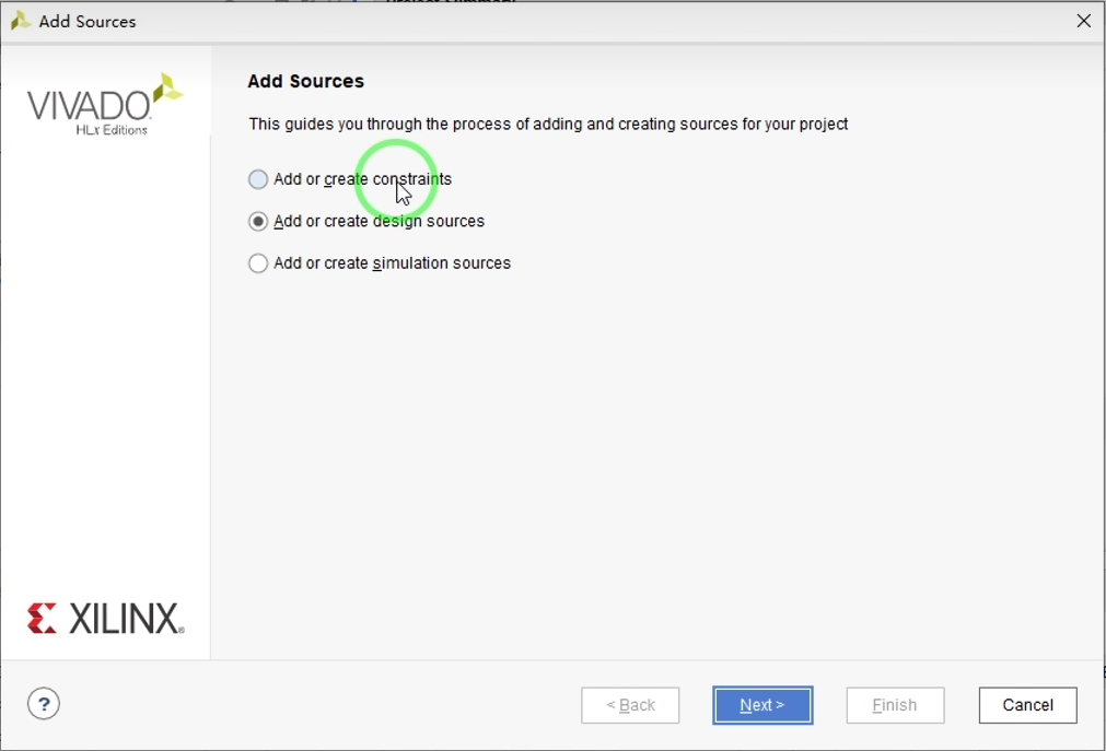 第一个选项是添加一个约束(物理相关的信息),第二个是创建或添加一个设计源文件,第三个是创建一个用于仿真的源文件。这里选择第二个选项即可。