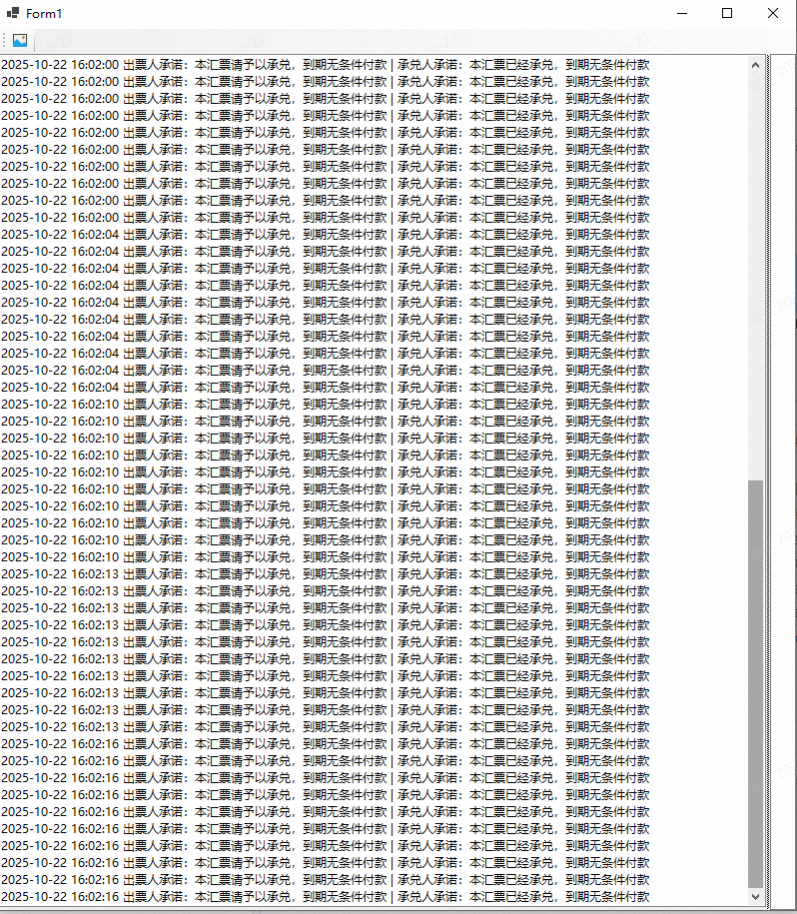 {public partial class Form1 : Form{public Form1(){InitializeComponent();Control.CheckForIllegalCrossThreadCalls = false;}private void toolStripButton1_Click(object sender, EventArgs e){for (int i = 0; i < 10; i++){Task task = Task.Run(() => Thread1());}}void Thread1(){//上传需要识别的图片WorkflowAppApiClient workflowAppApiClient = new WorkflowAppApiClient("https://agent.cloud-uat.XXXXX.cn/v1", "app-65i3syVDIQ6U3op3mVdKEXXX");FileUploadResponse fileUploadResponse = workflowAppApiClient.FileUpload(FileToBinaryConverter.ConvertFileToBinary("d:\\527800.png"), "527800.png");// ps(listBox1, fileUploadResponse.id);//准备调用工作流的参数,注意:智能体的文件输入必须是多个文件,设置成单文件会报错!Dictionary<string, object> inputkeyValuePairs = new Dictionary<string, object>();List<FileListElement> fileListElements = new List<FileListElement>();fileListElements.Add(new FileListElement(upload_file_id: fileUploadResponse.id, "image", "local_file", null));inputkeyValuePairs.Add("input_file", fileListElements); // input_file 是自己在dify中的命名参数//调用工作流ExecuteWorkflowRequest executeWorkflowRequest = new ExecuteWorkflowRequest(inputkeyValuePairs, user: "abc-123", ResponseMode.Blocking);CompletionResponse completionResponse = workflowAppApiClient.ExecuteWorkflow(executeWorkflowRequest);// ps(listBox1, completionResponse.RealJsonstring);// textBox1.Text = (completionResponse.data.outputs["text"].ToString());// Console.WriteLine(completionResponse.RealJsonstring);// ps(listBox1, completionResponse.data.outputs["text"].ToString());ps(listBox1, completionResponse.data.outputs["text"].ToString());}public void ps(ListBox box, string s){String line = DateTime.Now.ToString("yyyy-MM-dd HH:mm:ss") + " " + s;box.Items.Add(line);}}