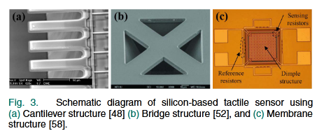 硅基传感器的三种结构 ——3a 悬臂梁(像小树枝,一端固定,另一端受压会弯)、3b 桥(两端固定,中间受压会向下凸)、3c 膜(像气球皮,受压会鼓起来);但硅脆,后来改进用柔性基板(比如聚酰亚胺、PDMS)